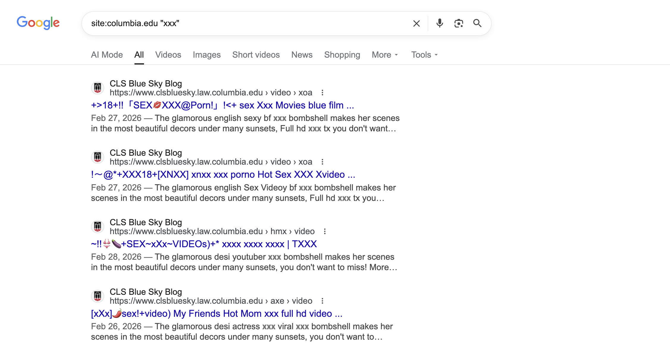 The sites included berkeley.edu, columbia.edu, and washu.edu, the official domains for the University of California, Berkeley, Columbia University, and Washington University in St. Louis. Subdomains such as hXXps://causal.stat.berkeley.edu/ymy/video/xxx-porn-girl-and-boy-ej5210.html, hXXps://conversion-dev.svc.cul.columbia[.]edu/brazzers-gym-porn, and hXXps://provost.washu.edu/app/uploads/formidable/6/dmkcsex-10.pdf. All deliver explicit pornography and, in at least one case, a scam site falsely claiming a visitor’s computer is infected and advising the visitor to pay a fee for the non-existent malware to be removed. In all, researcher Alex Shakhov said, hundreds of subdomains for at least 34 universities are being abused. Search results returned by Google list thousands of hijacked pages.